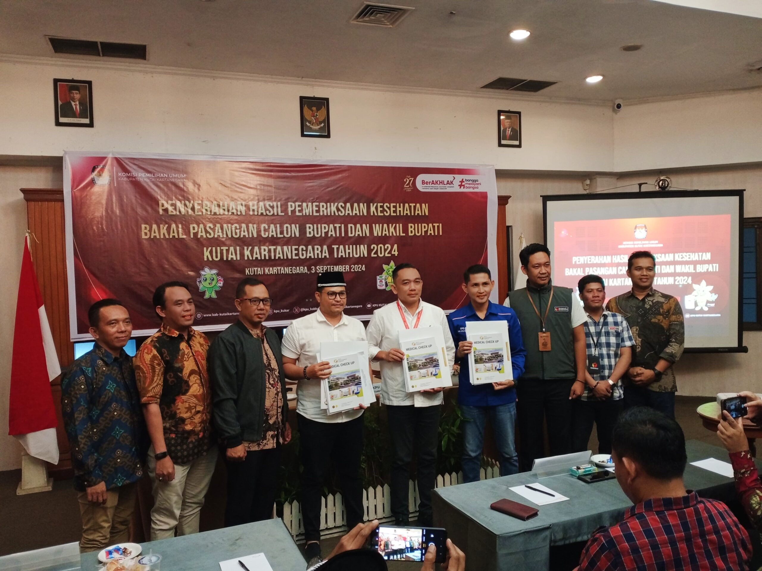 Dan pada Selasa (3/9/2924) malam tadi, hasil tes kesehatan yang telah diterima oleh KPU Kukar itu dibagikan secara resmi ke masing-masing perwakilan Bapaslon dalam acara Penyerahan Hasil Pemeriksaan Kesehatan Bakal Pasangan Calon Bupati dan Wakil Bupati Kukar Tahun 2024, di Hotel Grand Elty Singgasana Tenggarong.