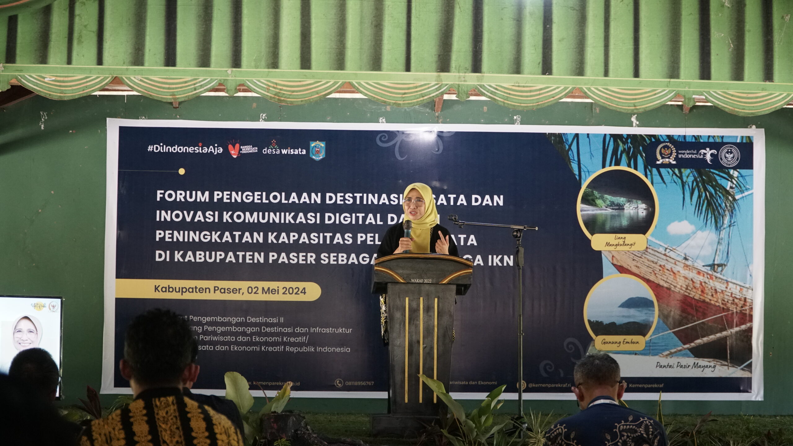 Hadir dalam acara tersebut Hetifah Sjaifudian (Wakil Ketua Komisi X DPR RI), Eddy Susilo (Analis Kebijakan Ahli Madya Kemenparekraf RI), Romif Erwinadi (Plt Kepala Dinas Pemuda, Olahraga dan Pariwisata kab. Paser), dan Dian Rosita (Ketua PUTRI DPD Kaltim). Kegiatan diikuti oleh gak kurang dari 70 orang pelaku dan penggiat Pariwisata dan Ekonomi Keeatif Kabupaten Paser.