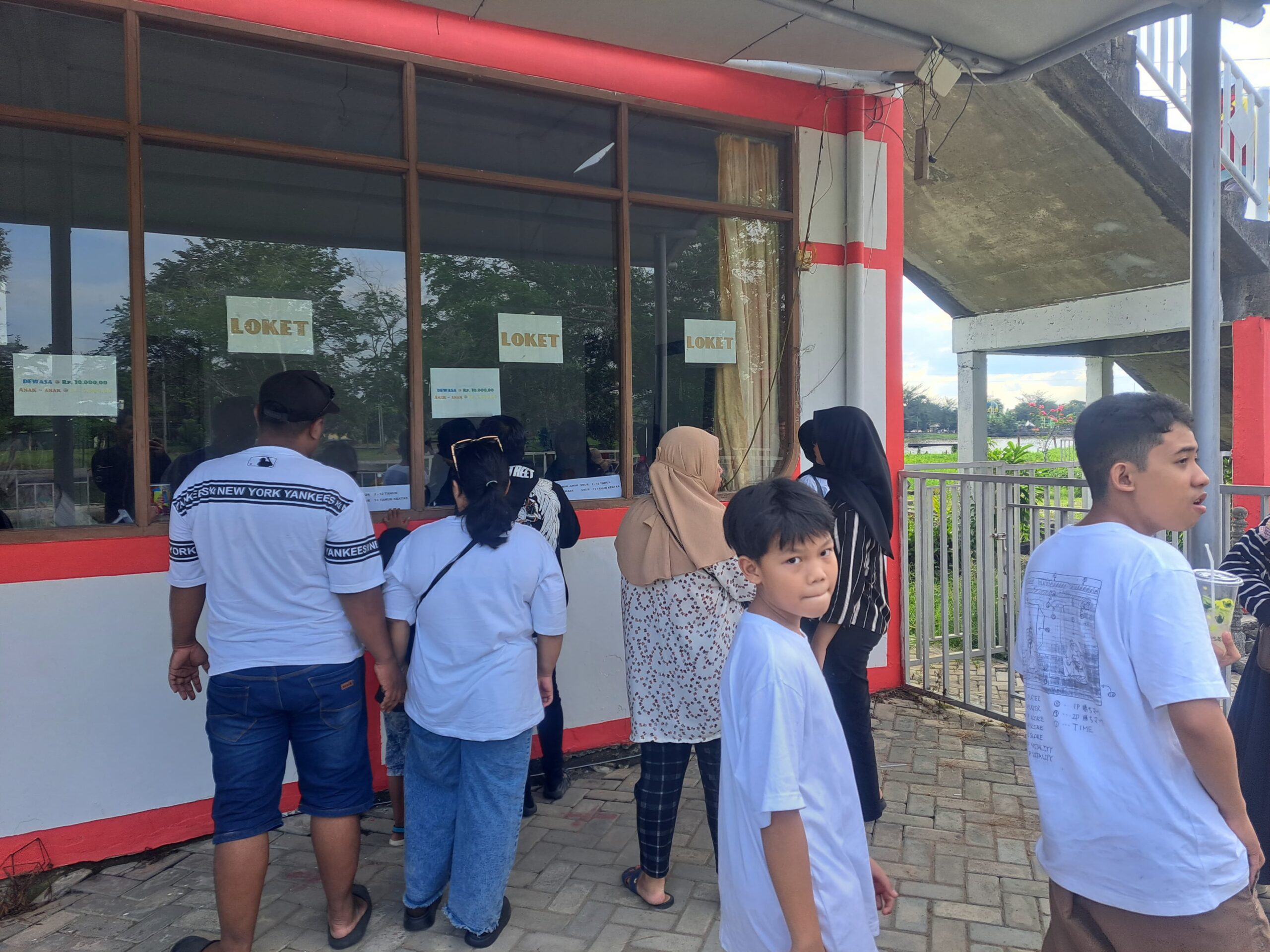 Teks Foto : Suasana loket pembelian karcis masuk Pulau Kumala Tenggarong yang ramai saat cuti bersama Idulfitri 1445 Hijriah. (Istimewa)