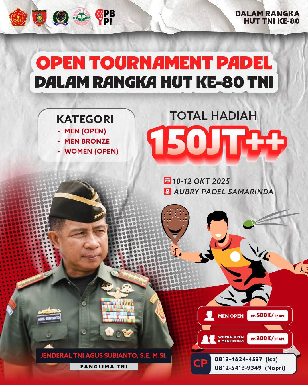 mediamahakam.com, SAMARINDA— Animo luar biasa mewarnai perhelatan Open Tournament Padel 2025 Piala Panglima TNI di Samarinda. Kejuaraan yang digelar oleh Korem 091/Aji Surya Natakesuma (ASN) ini resmi dibuka pada 10 Oktober 2025 dan akan berlangsung hingga 12 Oktober, menjadi bagian dari rangkaian peringatan HUT ke-80 TNI.
