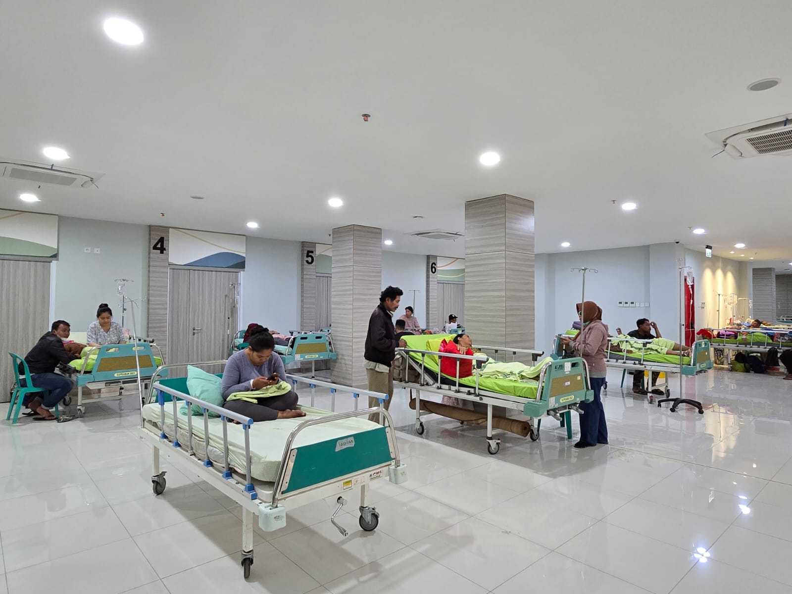 Saat ini tampak area lobi tersebut dialihfungsikan sebagai ruang rawat inap sementara bagi para pasien dari Gedung Enggang Lantai III yang mengalami tragedi plafon ambruk akibat terjangan hujan deras yang disertai angin kencang, Kamis (24/10/2024) sore tadi.