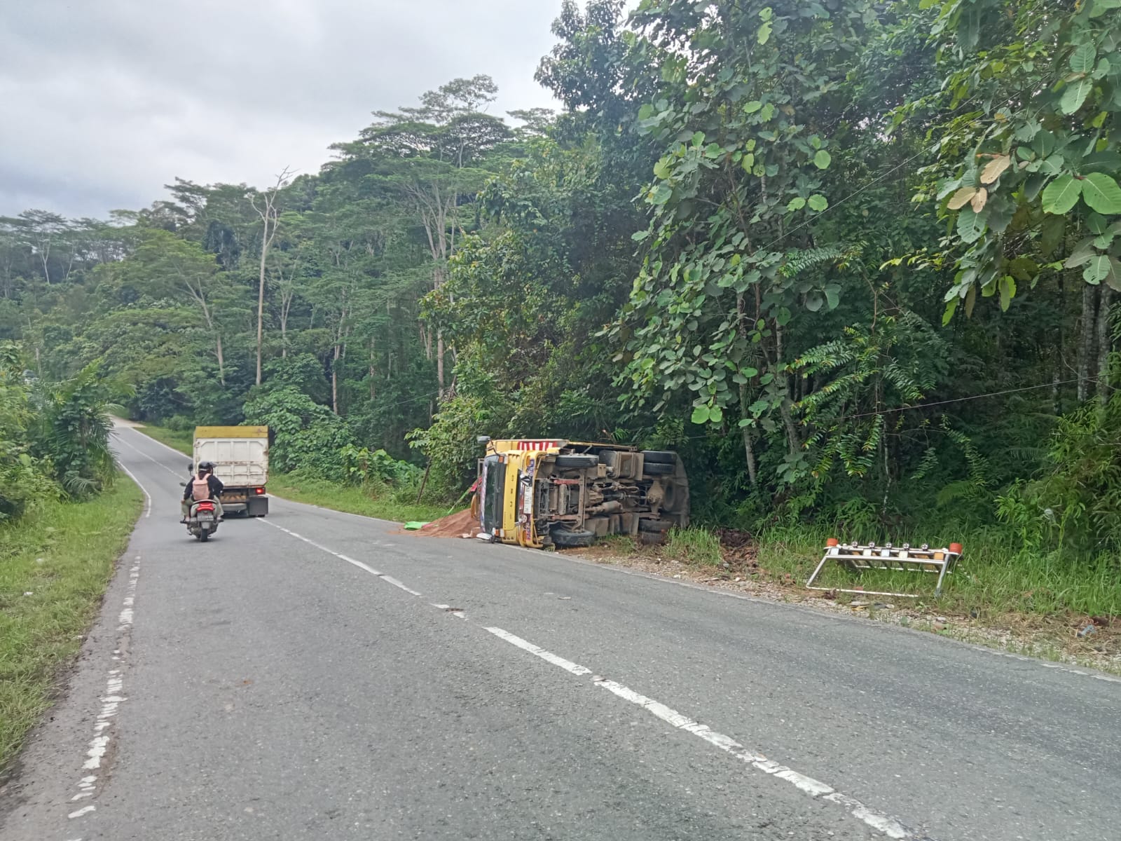 Insiden terjadi saat truk tidak mampu menanjak di kawasan perbukitan dan akhirnya terguling. Meski demikian, tidak ada korban jiwa dalam peristiwa tersebut.