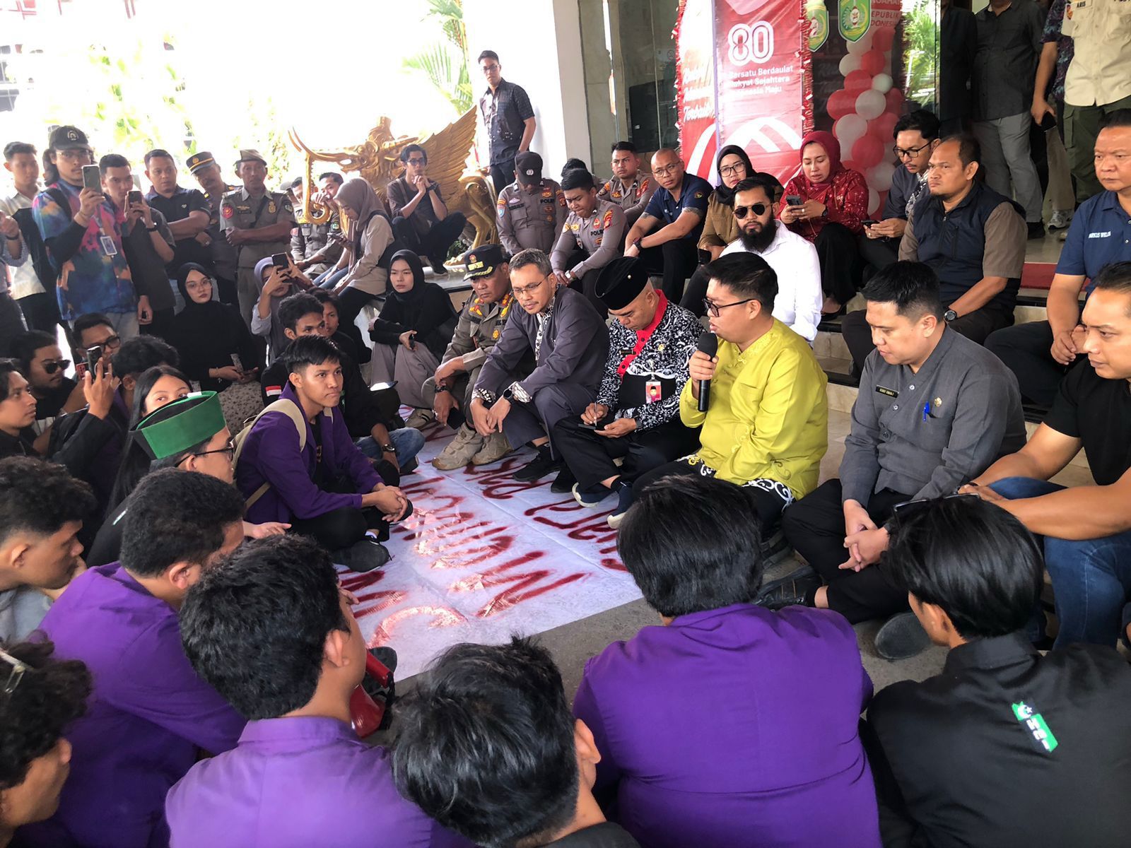 Teks : Wakil Bupati Kukar, Rendi Solihin saat berada di hadapan para masa aksi dari mahasiswa UNIKARTA